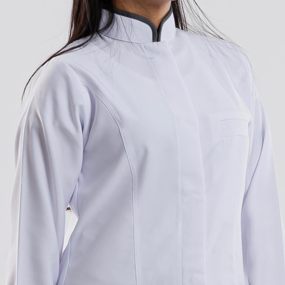 تصميم أنيق عملي يناسب الطبيبات والطالبات، يتميز بتحديد رمادي على الياقة والأكمام تضيف لمسة فريدة من الأناقة الاحترافية.