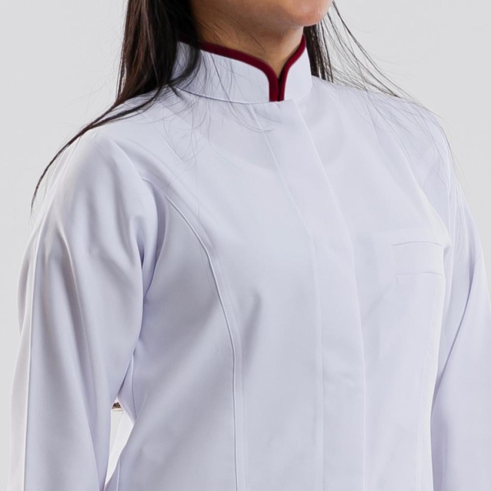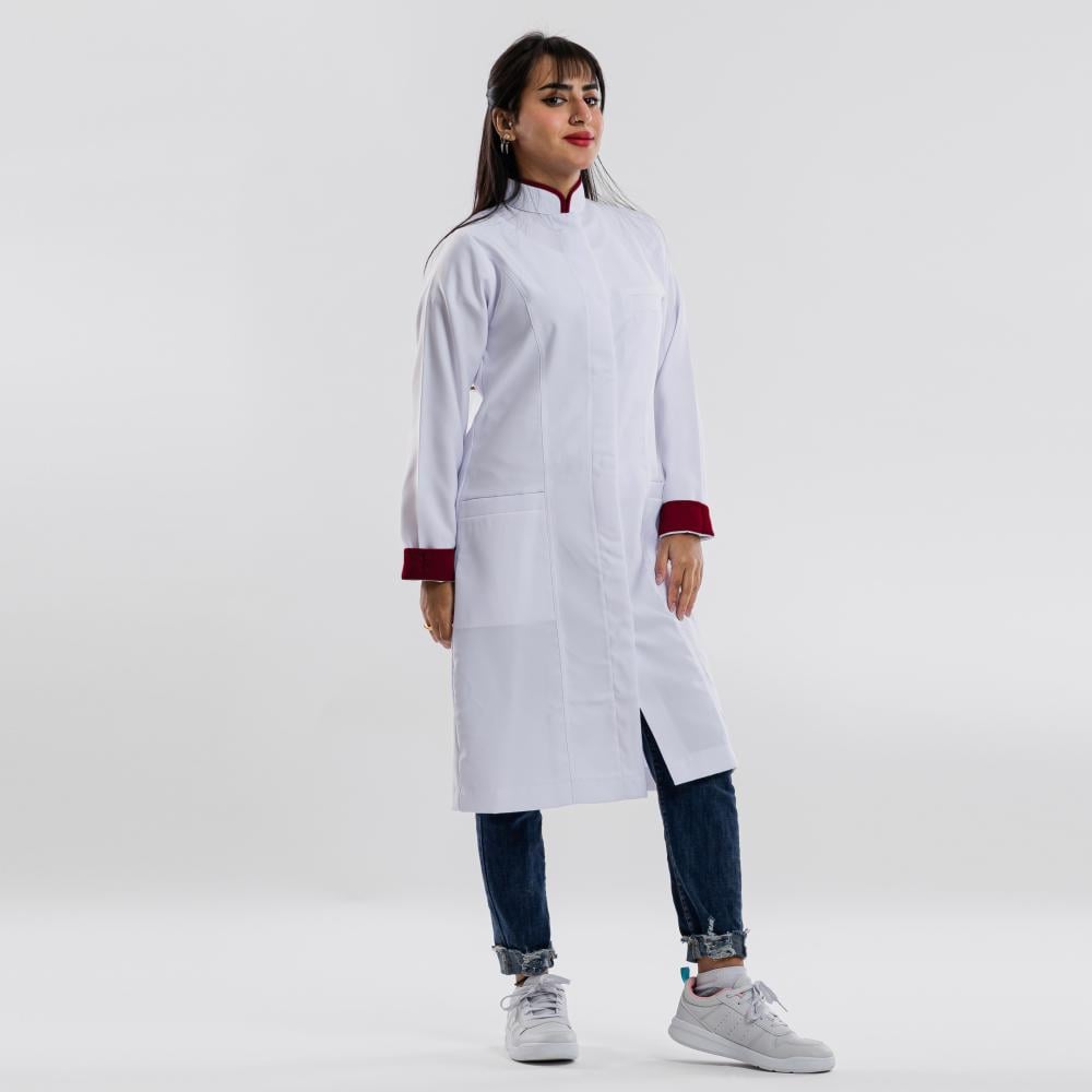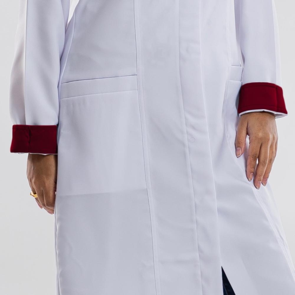 تصميم أنيق وفاخر بلون أبيض ناصع مع تحديد بلون عُودي جذاب على الياقة والأكمام، يضفي لمسة من التميز والرقي. مثالي للطبيبات والطالبات الباحثات عن إطلالة احترافية وراقية في بيئة العمل.